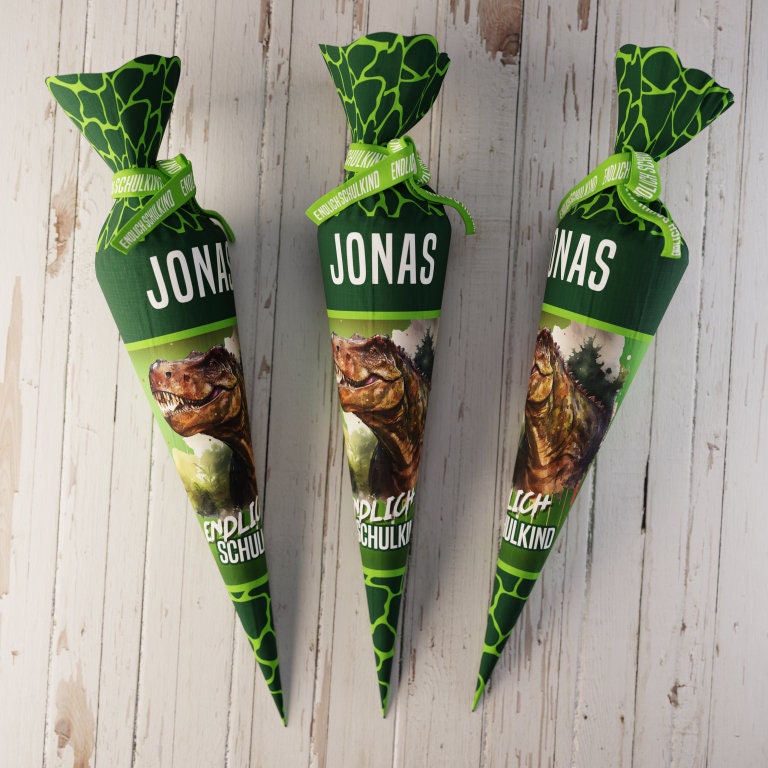 Schultüte mit Applikation / Stickerei / Stickmotiv - 70cm oder 85cm - Dino gestickt auf Kristallgrün - S26-1