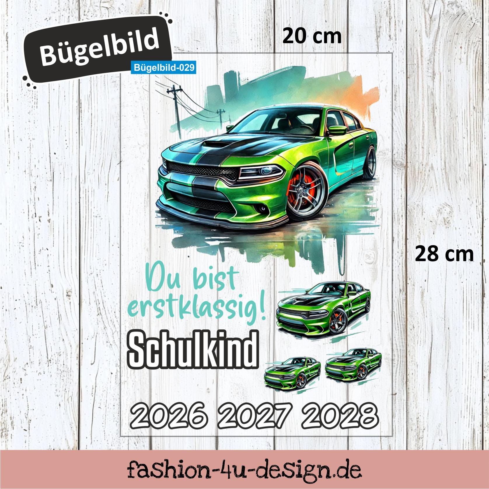 Bügelbild 029 "Sportwagen Rennauto - Schulkind 2026/27/28" | Transfer, DIY, Applikation zur Einschulung, für die Schultüte oder Accessoires