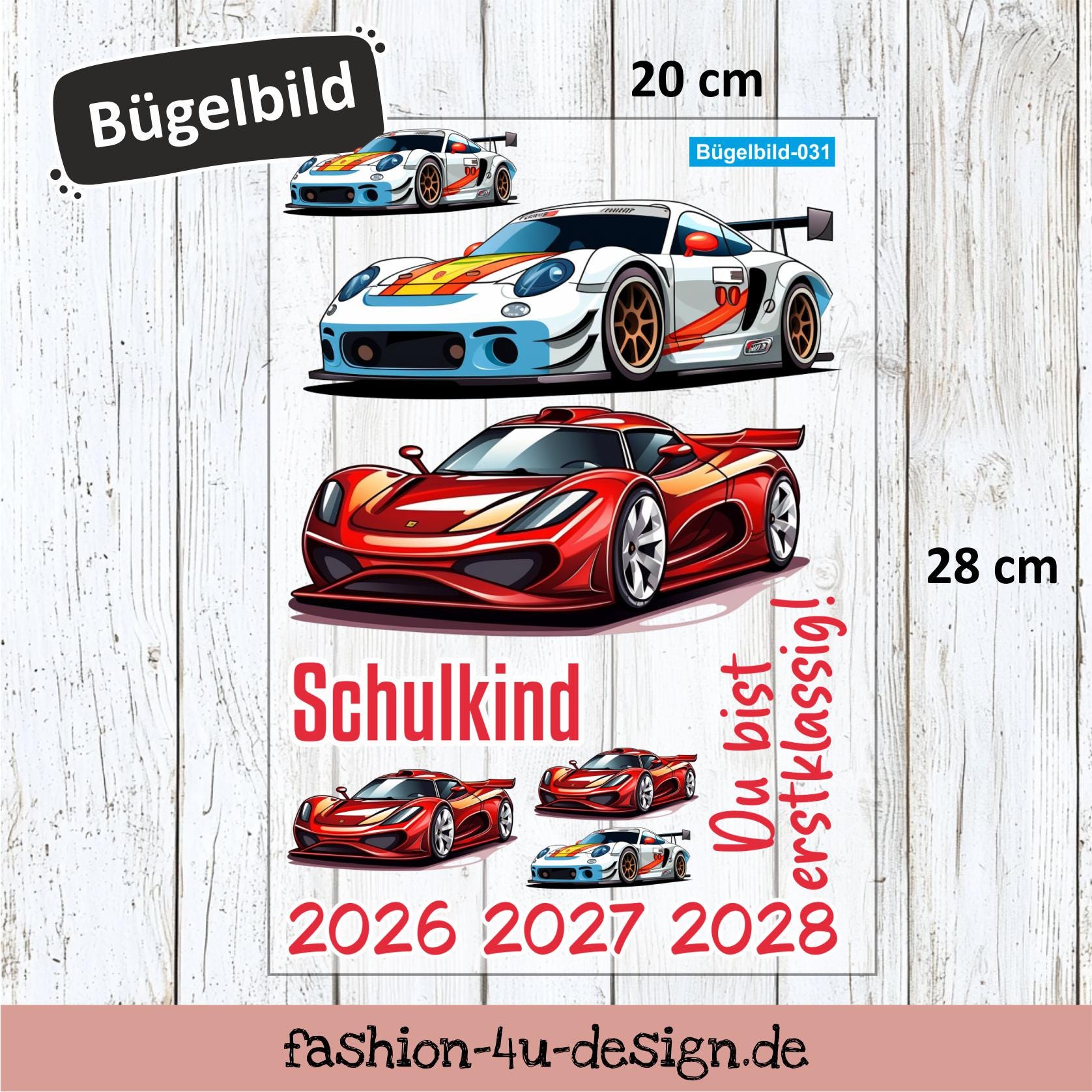 Bügelbild 031 "Sportwagen Rennauto - Schulkind 2026/27/28" | Transfer, DIY, Applikation zur Einschulung, für die Schultüte oder Accessoires