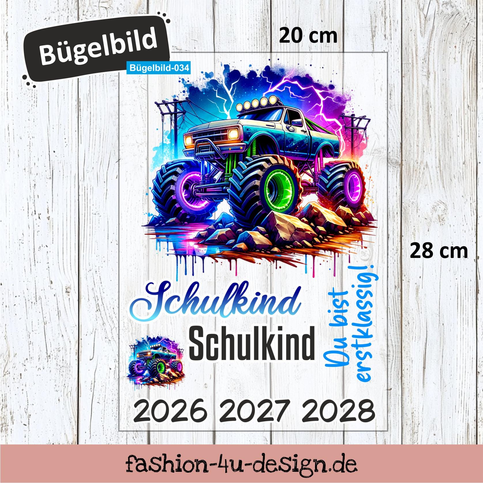 Bügelbild 034 "Monster Truck Bunt - Schulkind 2026/27/28" | Transfer, DIY, Applikation zur Einschulung, für die Schultüte oder Accessoires