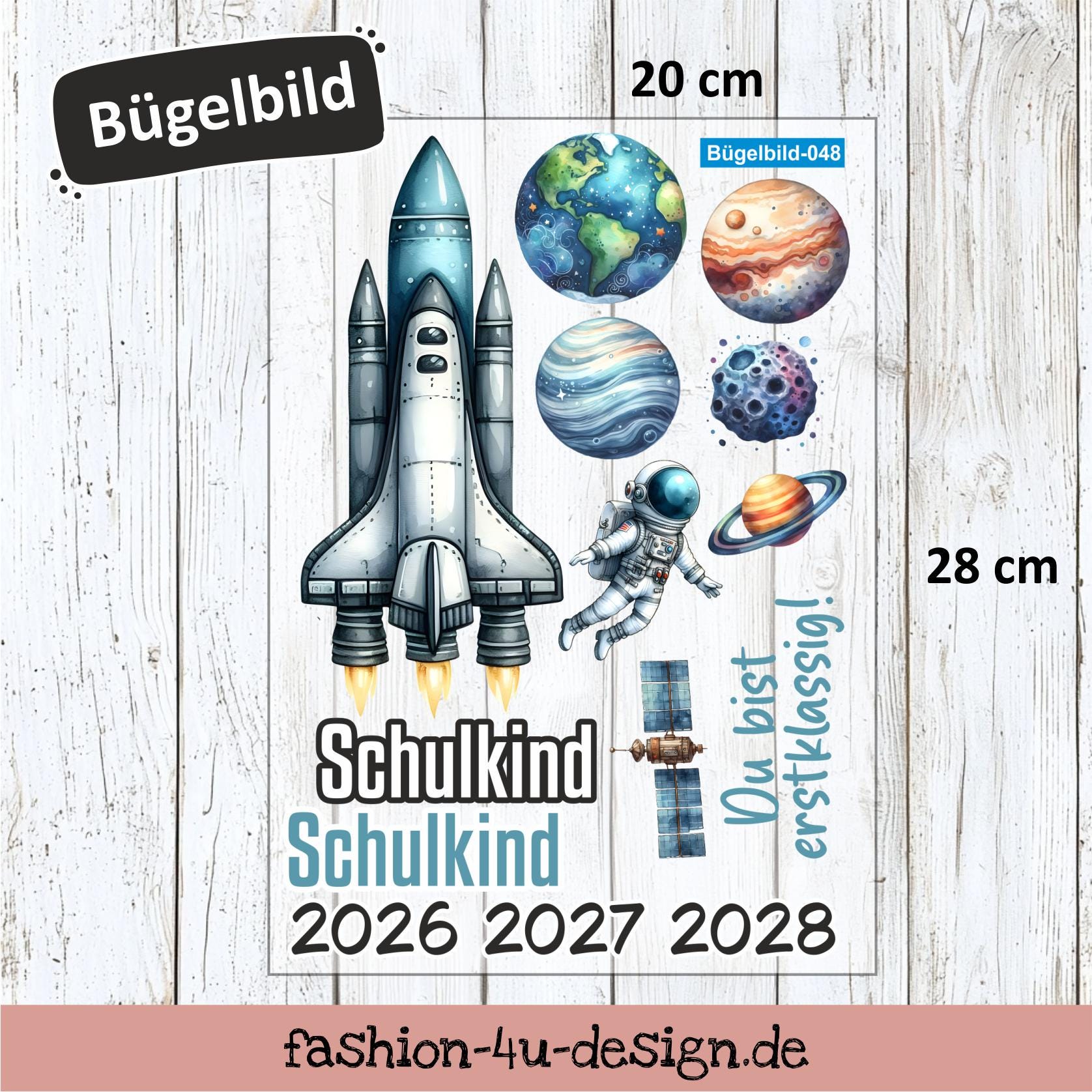 Bügelbild 048 "Space Shuttle - Schulkind 2026/27/28" | Transfer, DIY, Applikation zur Einschulung, für die Schultüte oder Accessoires