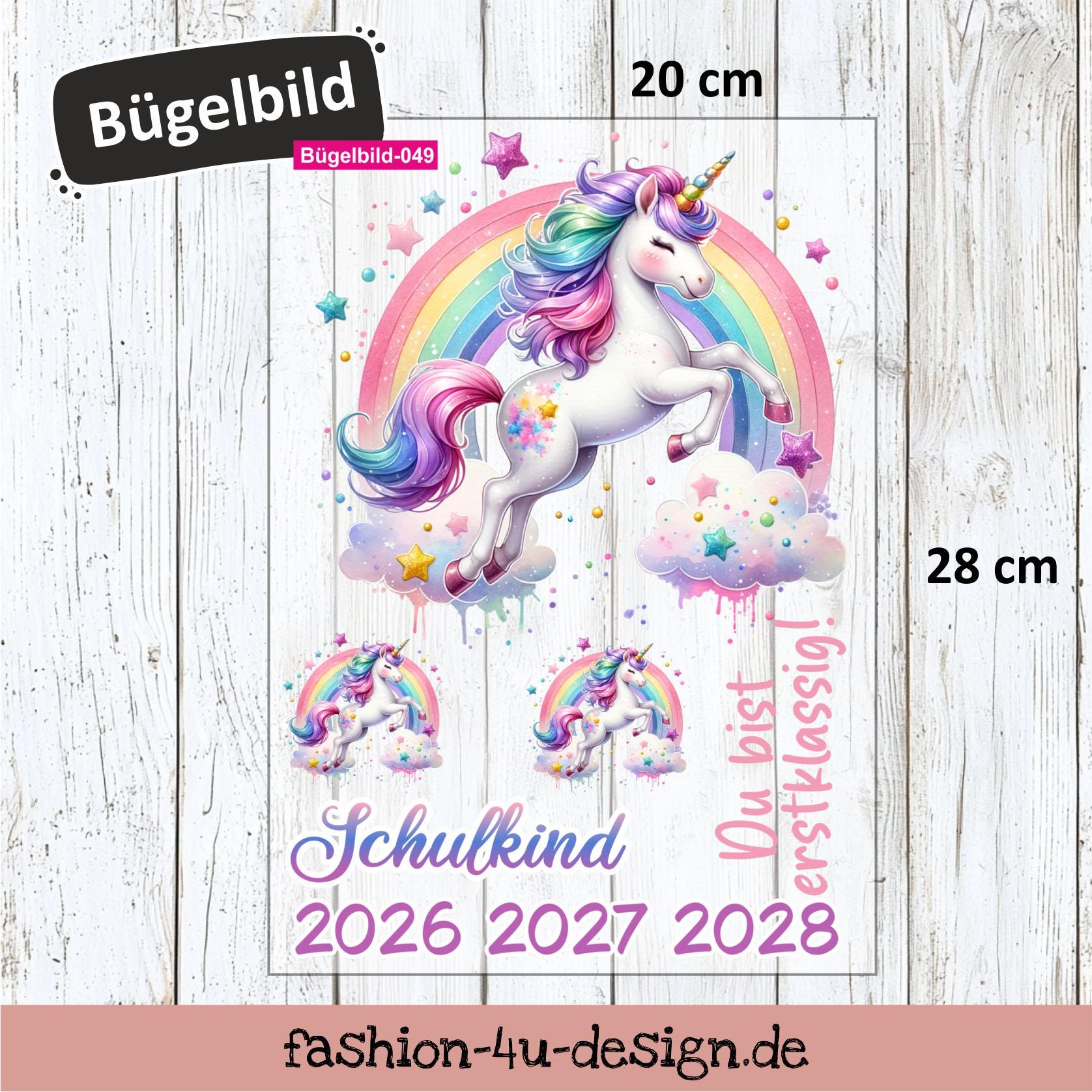 Bügelbild 049 "Regenbogen Einhorn 2026/27/28" | Transfer, DIY, Applikation zur Einschulung, für die Schultüte oder Accessoires