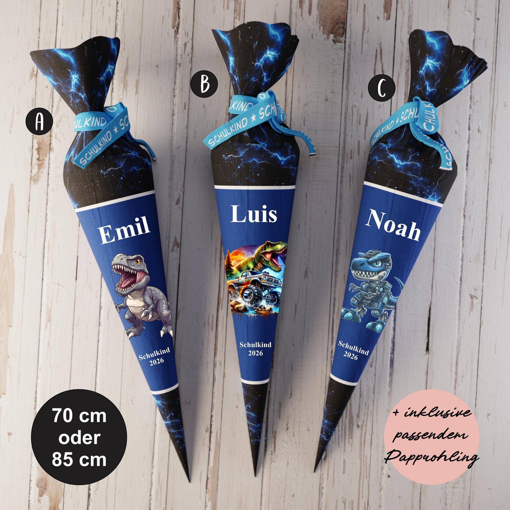 Schultüte: Dino, T-Rex - DIY Näh-Set 70 cm oder 85 cm - selber nähen oder fix&fertig genäht - Gewitter im Weltall inkl. Papprohling