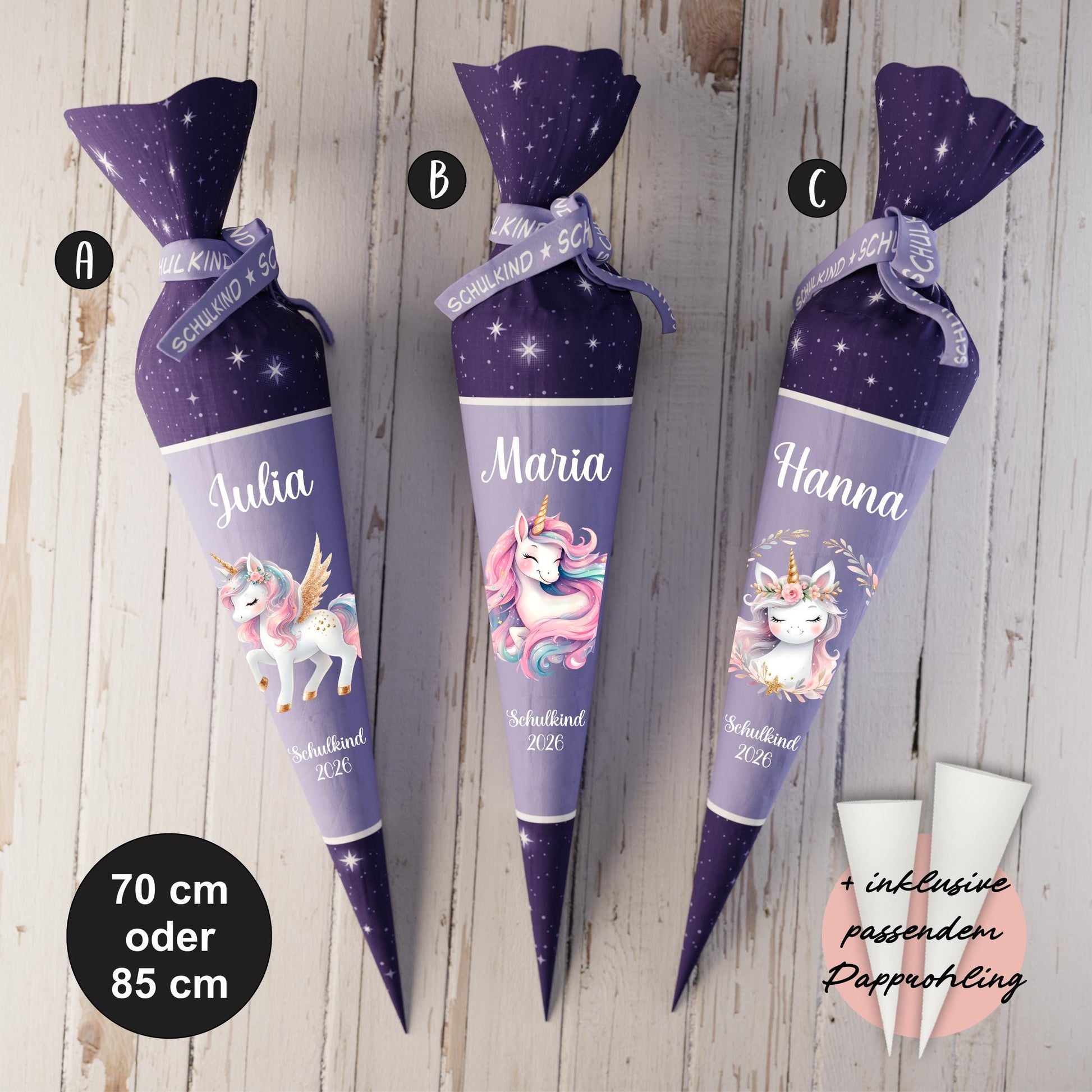 Schultüte: Einhorn, Fee, Elfe - DIY Näh-Set 70 cm oder 85 cm - selber nähen oder fix&fertig genäht - Weltall Nachtlila inkl. Papprohling