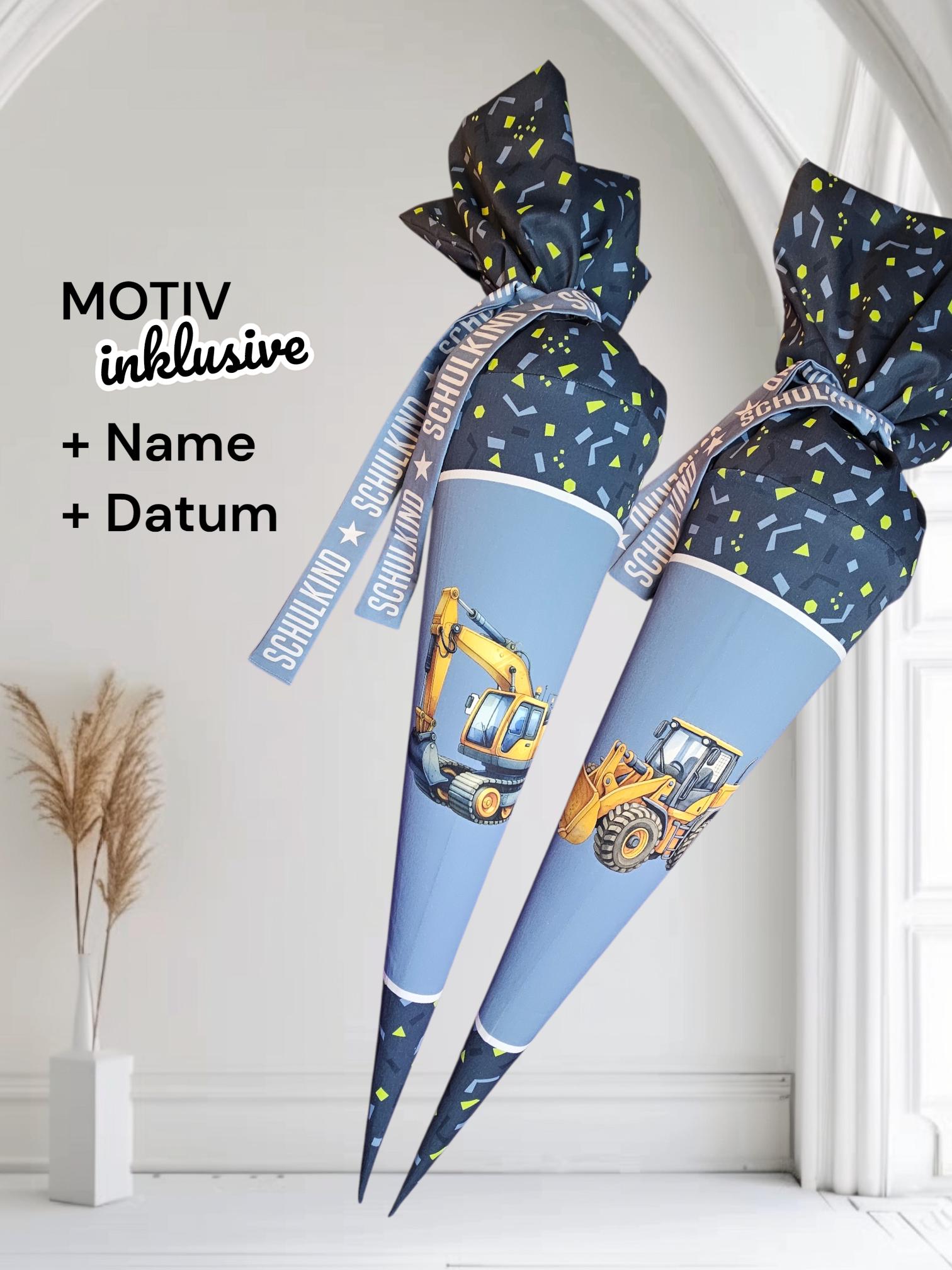 Schultüte mit Motiv (Bügelbild / bedruckt) - 70cm oder 85cm - Bagger auf Baustellenabenteuer inklusive Name und Datum