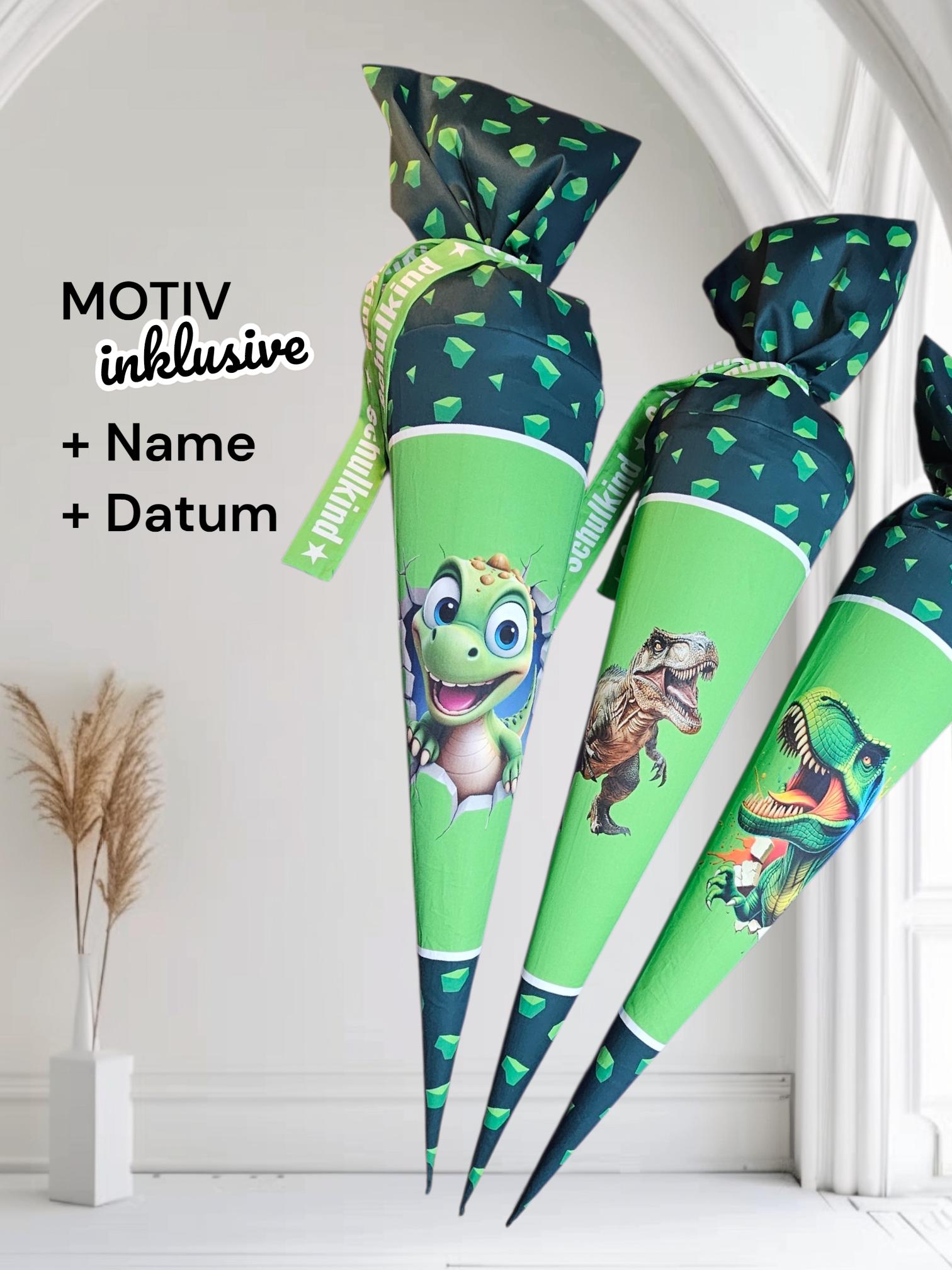 Schultüte mit Motiv (Bügelbild / bedruckt) - 70cm oder 85cm - Dino auf Kristallgrün inklusive Name und Datum