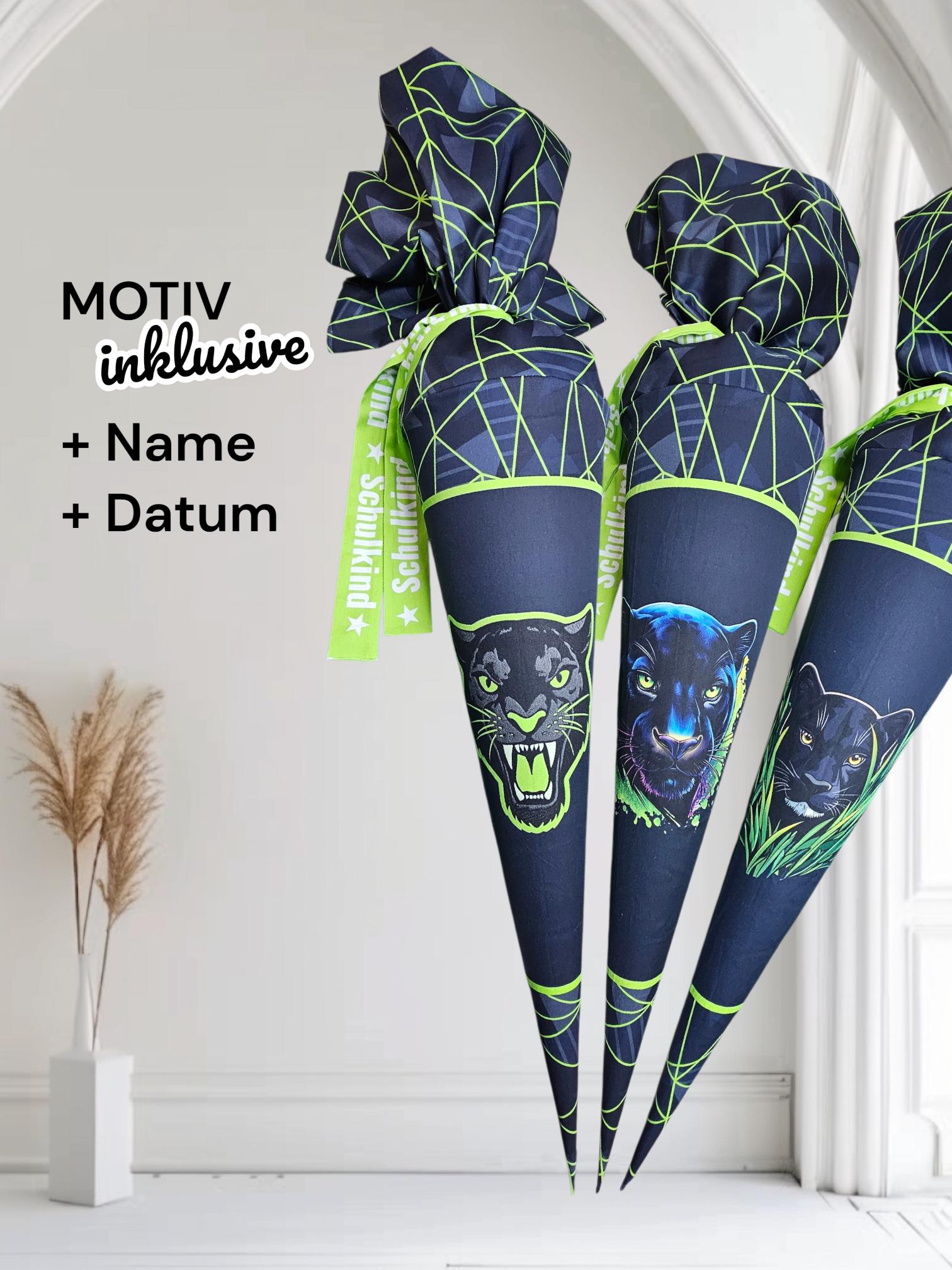 Schultüte mit Motiv (Bügelbild / bedruckt) - 70cm oder 85cm - Panther auf Dark with Stripes inklusive Name und Datum